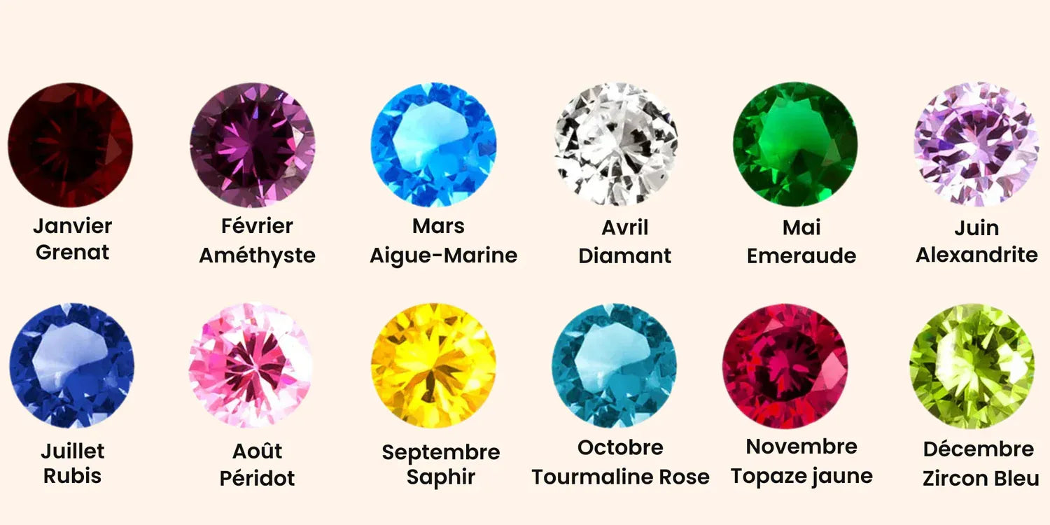 Chaque mois correspond à une pierre précieuse symbolique (ex. : janvier = grenat, février = améthyste, mars = aigue-marine, etc.).