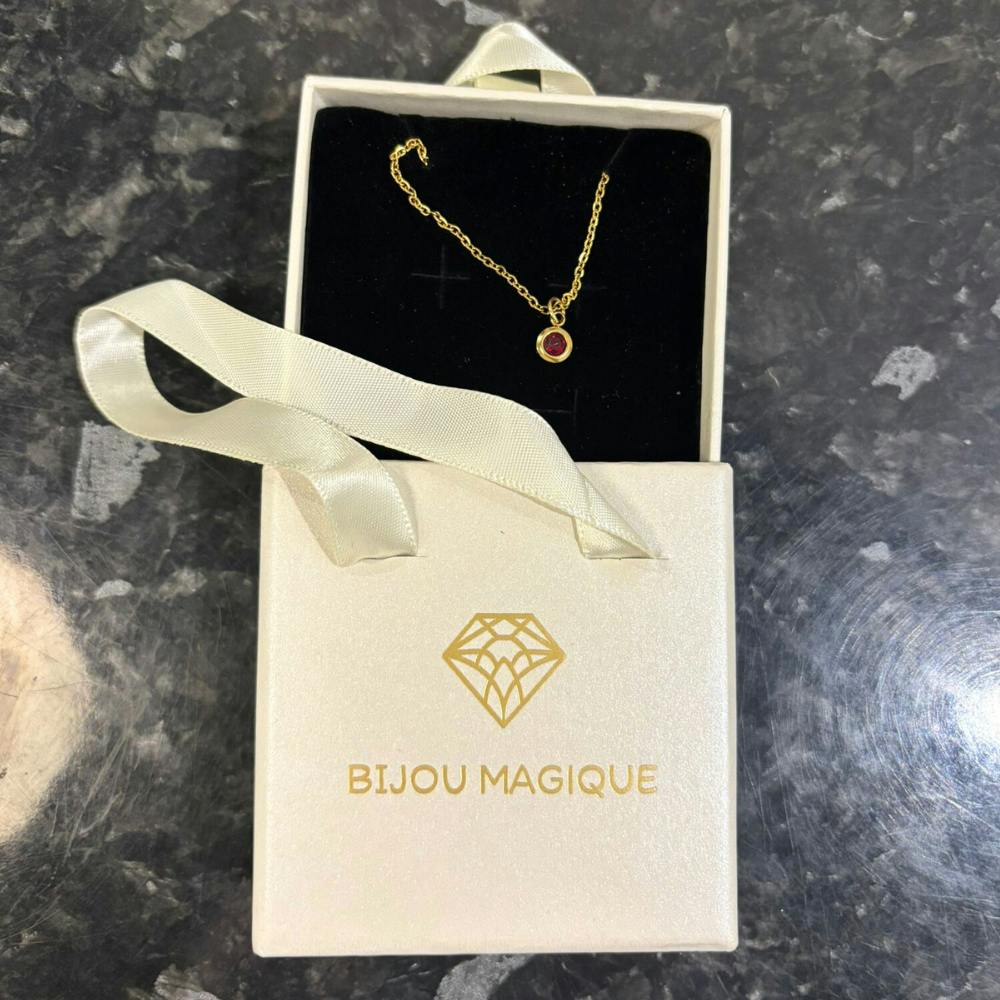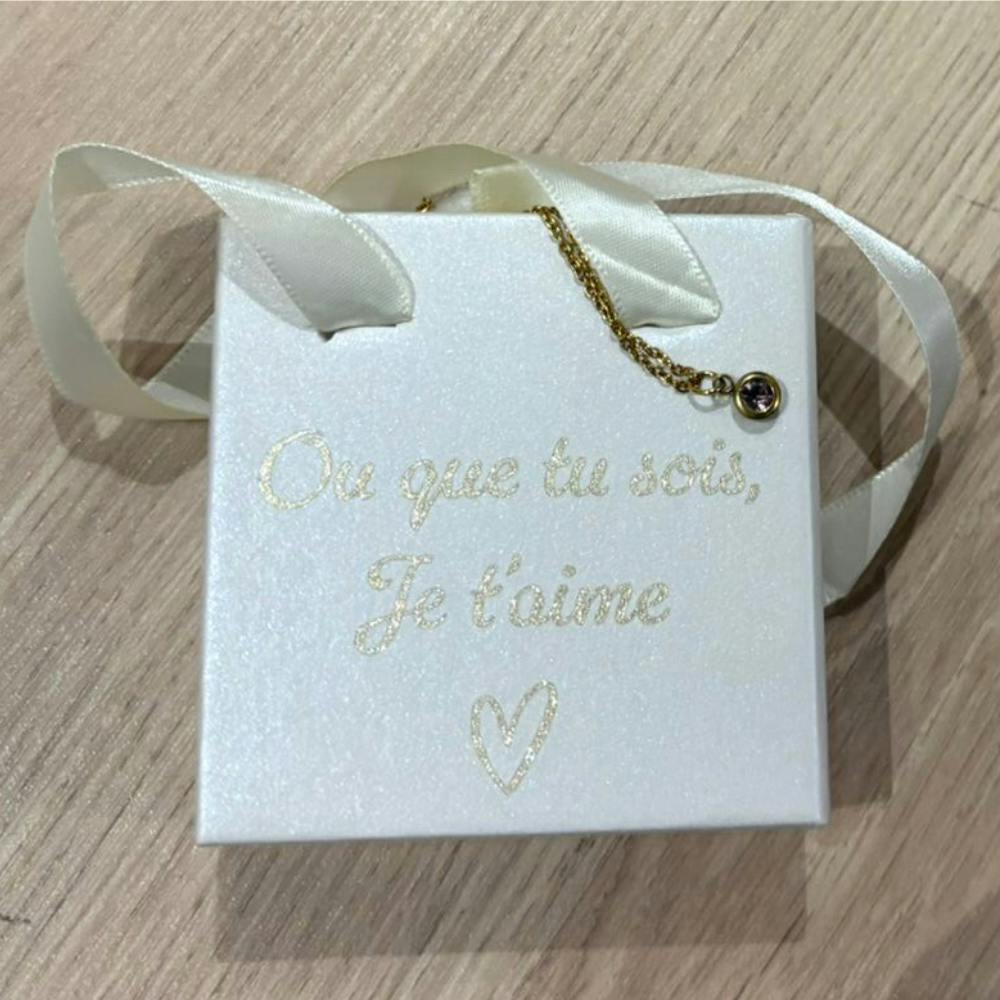 Chaque bijou porte une pierre de naissance correspondant au mois choisi, et au dos de la boîte, vous pouvez inscrire un message secret en lettres dorées.